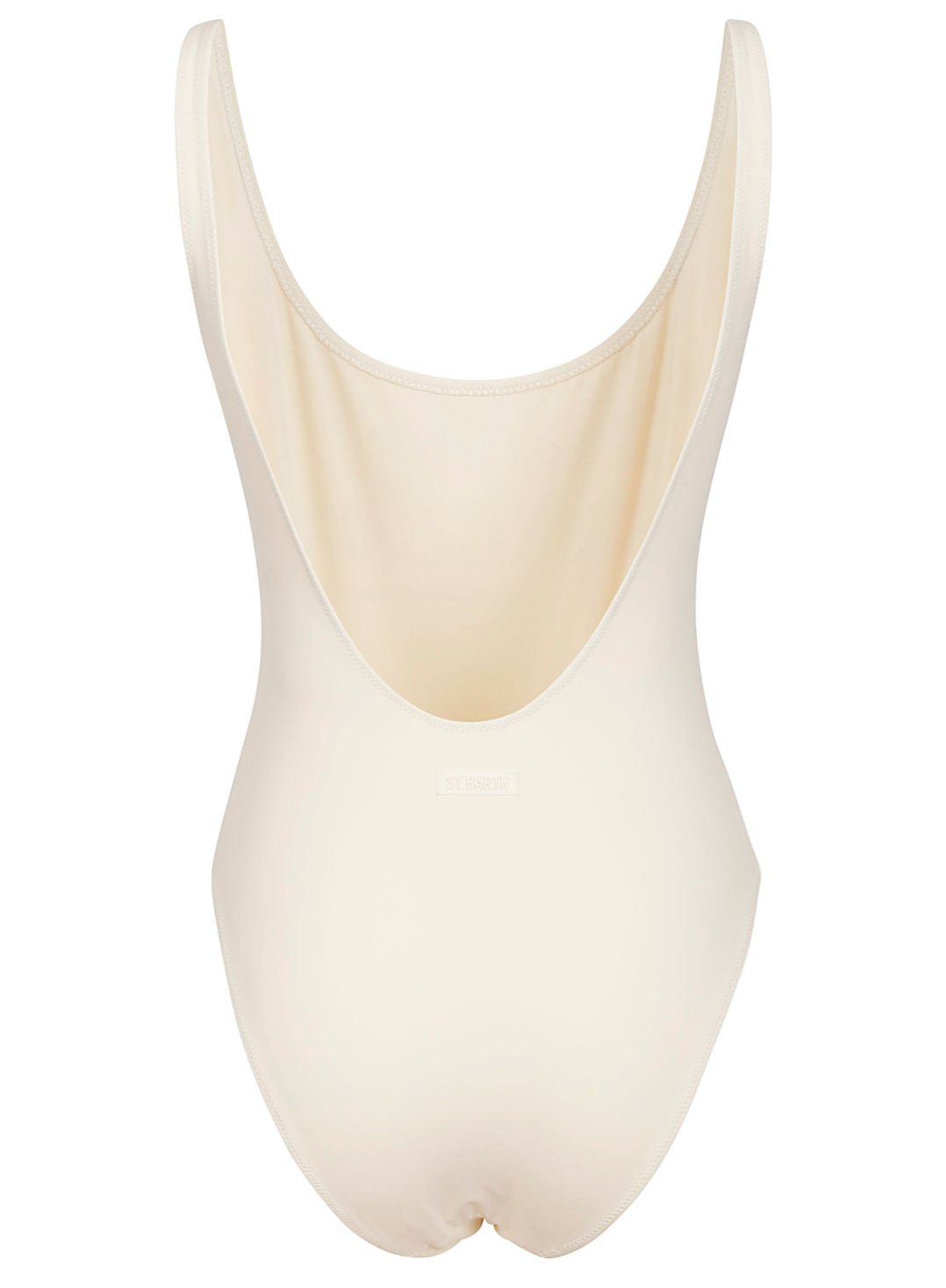 St. Barth women's one-piece swimsuit, thin straps, V-neck, silver rhinestone logo, stretch fabric, lycra lining, regular fit. You can wear it as a swimsuit on your summer days on the beach and by the pool, or as a bodysuit to brighten up your evenings.