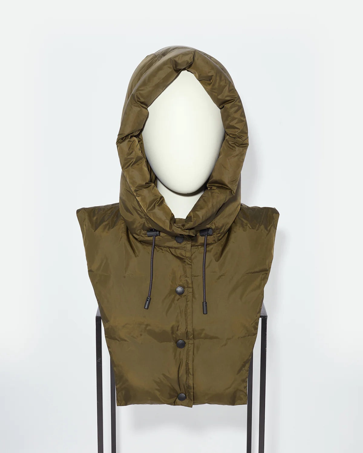 The iconic down jacket turns into a statement accessory for a resolutely modern look. Crafted from a water-repellent technical fabric and padded with high-quality down and duck feathers to guarantee comfort, warmth and breathability, this hooded bib features a drawstring and a press-stud fastening. Lightweight, functional and edgy, it's a new essential to mix and match with the other pieces of the collection for a new contemporary silhouette.