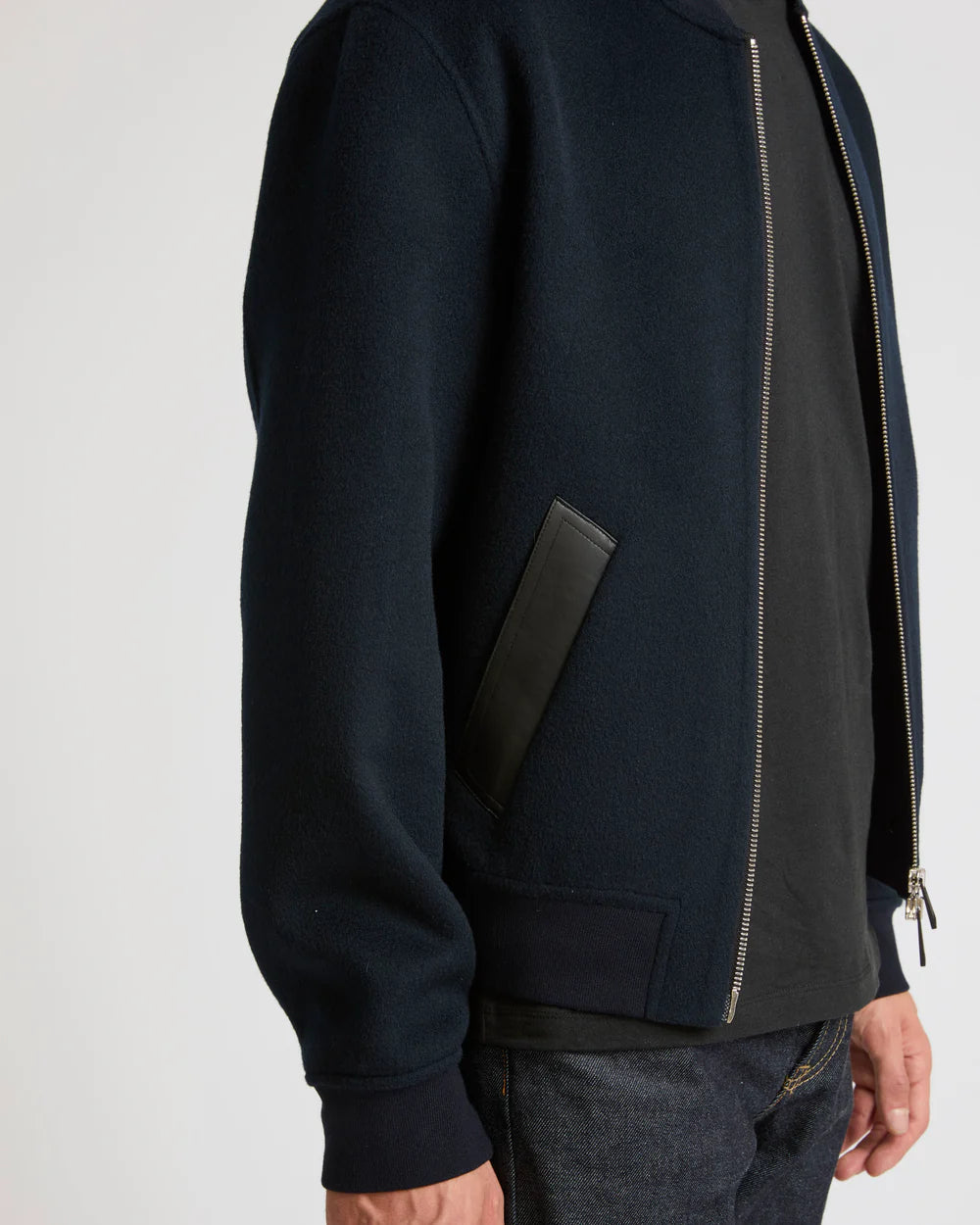 - Leather zip protective lips and welt pockets